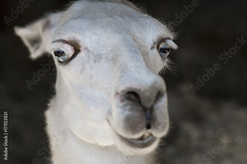 © marketlan, Obraz premium Portrait of a white llama with big eyes in a zoo. Closeup, selective focus