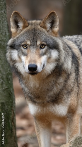 Fototapeta premium Portrait of a Wild Grey Wolf Facing Forward with Alert Expression in Natural Habitat