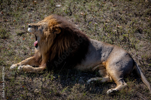 © Ann, Naklejka premium Portrait of a wild roaring lion. The lion lies on dry grass. Taigan Park