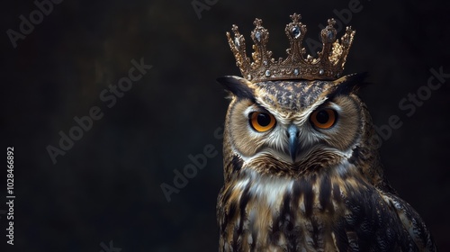 © Pixels , Fototapeta premium Portrait of a wise owl wearing a crown, velvet luxurious studio backdrop, soft lighting, professional photography, copy space