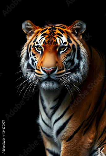 © Go, Fototapeta premium Portrait of a withe tiger with a black background, dinamic scene, with white tones