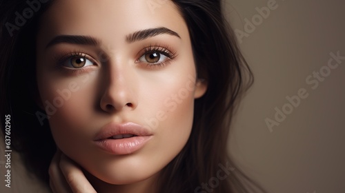 Obraz premium Portrait of a Woman: Close-up portrait of a young woman with beautiful brown eyes and long dark hair, showcasing her natural beauty and flawless skin. The soft lighting enhances her features.