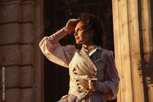 © kinomaster, Obraz premium Portrait of a woman in vintage clothing, illuminated by warm sunlight, against a backdrop of ancient architecture.