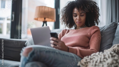 © Dao, Naklejka premium Portrait of a woman using laptop and a phone and checking email or news online while sitting on sofa at home. Searching for friends in internet social networks or working on computer. Copy space.