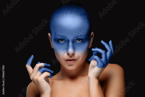 Fototapeta premium Portrait of a woman who is posing covered with blue paint