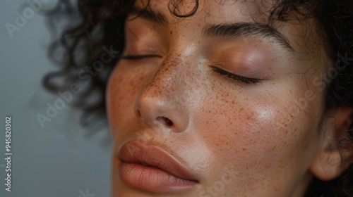 Fototapeta premium Portrait of a woman with closed eyes on a gray background, showcasing beauty and skincare. Emphasis on healthy skin and makeup aesthetics after a skincare treatment