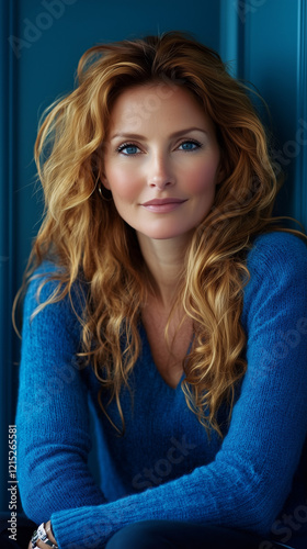 Fototapeta premium Portrait of a woman with curly blonde hair, wearing a blue sweater, seated...