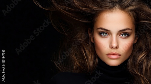 © Raul, Fototapeta premium Portrait of a woman with long, flowing brown hair and green eyes, wearing a black turtleneck against a dark background.
