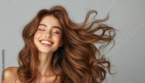 Fototapeta premium Portrait of a woman with perfect makeup and luxurious voluminous curls on a neutral background