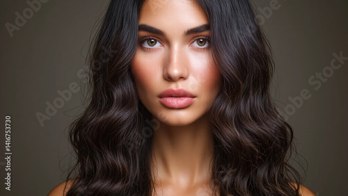 Fototapeta premium Portrait of a woman with wavy dark hair and light brown eyes