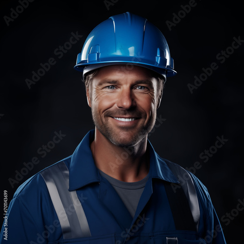 Fototapeta premium Portrait of a worker in a Blue Hard Hat helmet