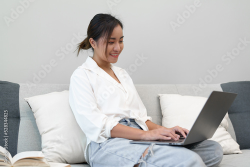 © Jirapong, Naklejka premium Portrait of a young Asian woman sitting on the sofa using a computer.