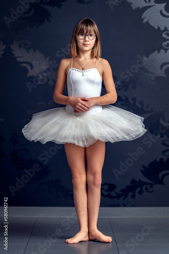 Fototapeta premium portrait of a young ballerina girl in white ballet dress