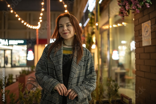 © shymar27, Obraz premium Portrait of a young beautiful cheerful red-haired girl in an evening autumn city.