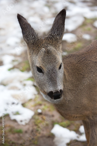 Fototapeta premium Portrait of a young beautiful deer in the meadow.