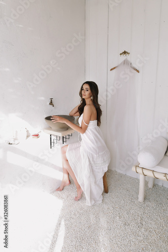 Naklejka premium Portrait of a young beautiful woman. Bride in elegant classic wedding dress. Morning of the bride. Wedding preparations.