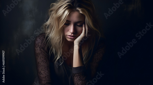 Fototapeta premium Portrait of a young blonde woman sitting on a floor, holding her head....