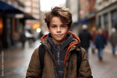 Fototapeta premium Portrait of a young boy in a city street. Shallow depth of field.