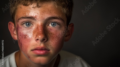© A4719, Fototapeta premium Portrait of a Young Boy with Scars and Bruises on His Face
