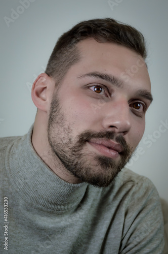 Fototapeta premium Portrait of a young brown-haired man with a short beard and a gray turtleneck sweater