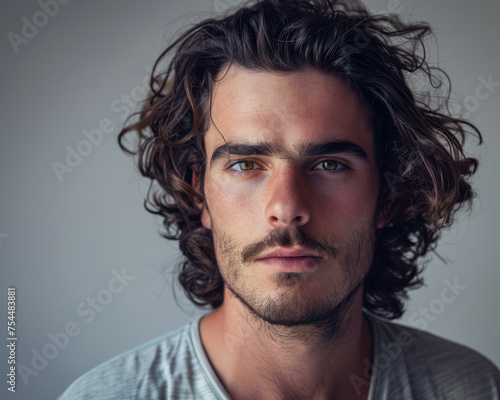 © Chari, Fototapeta premium Portrait of a young caucasian man isolated from a grey copy space background ideal for text