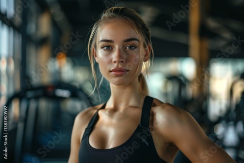 © CojanAI, Fototapeta premium Portrait of a young female caucasian fitness trainer in workout attire at the gym