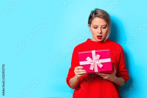© Masson, Fototapeta premium Portrait of a young girl in red sweater with gift box on blue background