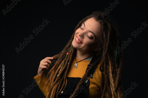 Fototapeta premium Portrait of a young girl with dreads on black background. Studio shoot.