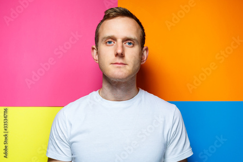 Obraz premium portrait of a young guy in a white t-shirt looking at the camera on a colored...