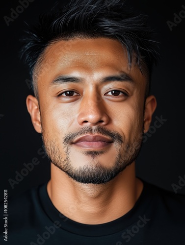 © Роман Варнава, Obraz premium Portrait of a young Indonesian man with a beard with a thoughtful expression, soft studio lighting on a dark background