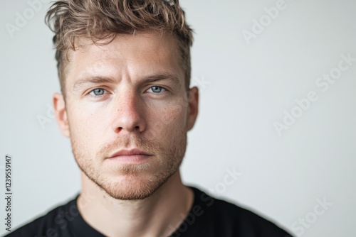 © J. Grayscale, Fototapeta premium Portrait of a Young Man with Intense Blue Eyes and Stylish Hair Against a Neutral Background