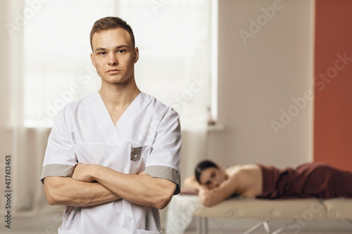 © Sergey Chayko, Obraz premium Portrait of a young masseur posing in his office
