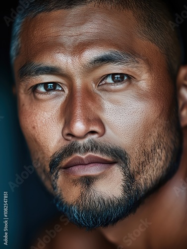 © Роман Варнава, Obraz premium Portrait of a young Mongolian man with a beard with a thoughtful expression, soft studio lighting on a dark background