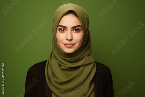 © Dani, Fototapeta premium Portrait of a young Muslim woman in green hijab with confident smile. A portrait of a young Muslim woman wearing a green hijab, looking confidently at the camera with a soft smile