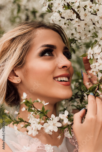 Fototapeta premium Portrait of a young smiling woman with near cherry blossoms in spring