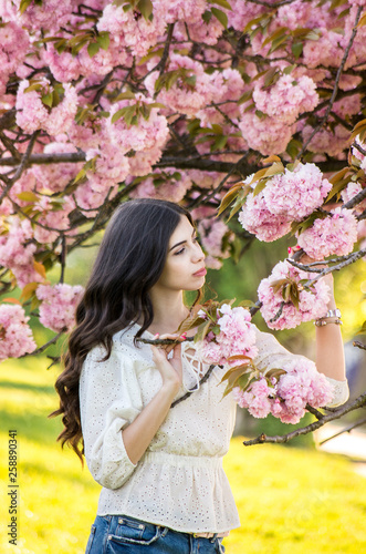 © pyansetia2008, Fototapeta premium portrait of a young teenage girl looking at blooming sakura trees