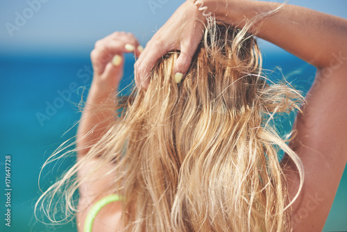 Obraz premium Portrait of a young woman against the sea. Back view.