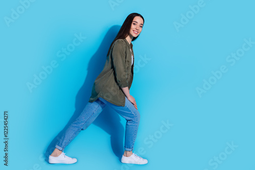 © deagreez, Fototapeta premium Portrait of a young woman casually dressed posing against a blue background with a smile