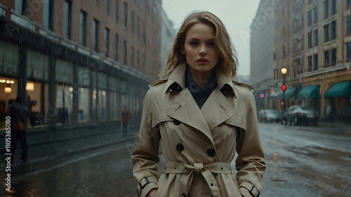 Fototapeta premium Portrait of a young woman in a beige trench coat standing in the rain on a city street