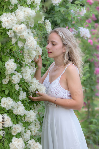 © g215, Fototapeta premium Portrait of a young woman in a park of roses
