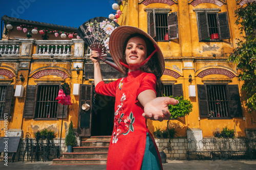 Fototapeta premium Portrait of a young woman in a traditional costume of Vietnamese culture in the ancient Hoi An area, Vietnam
