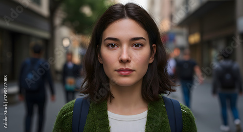 © Mirana, Fototapeta premium Portrait of a Young Woman on a Bustling Urban Street