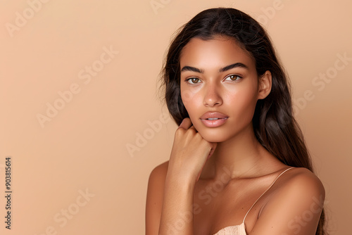 Obraz premium Portrait of a young woman with a natural beauty look on a beige background