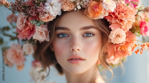 © KarpenArt Studio, Obraz premium portrait of a young woman with blue eyes and brown hair wearing a pink flower crown.
