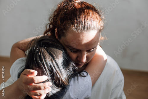 © Юля Бурмистрова, Naklejka premium Portrait of abused family. Young sad woman holding girl, protecting, consoling. Scared daughter hugging mother. Domestic violence, family conflicts, abuse, fighting, aggression, quarreling, care.