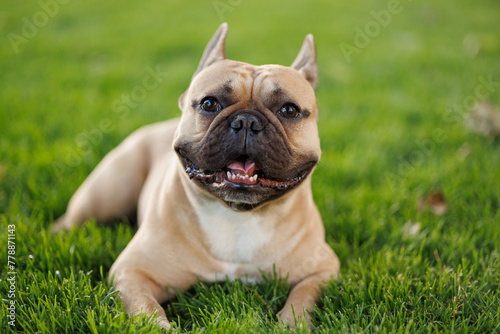 Fototapeta premium Portrait of adorable, happy dog of the French Bulldog breed in the park on the green grass at sunset.