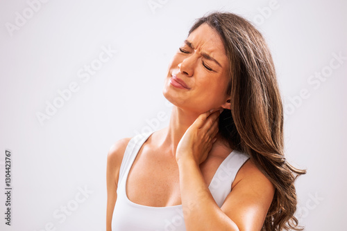 Fototapeta premium Portrait of adult woman who is having sprain in her neck.