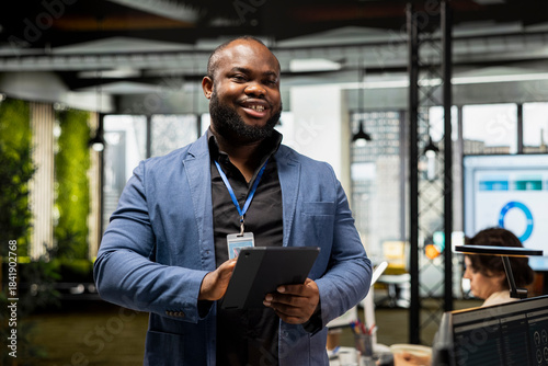 © DC Studio, Fototapeta premium Portrait of african american smiling worker does forecasting on his tablet, working in professional corporation office. Using multinational company vision with business solutions for growth.