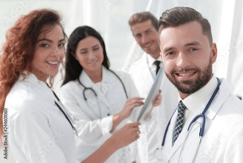 Fototapeta premium Portrait of aged male doctor teaching medical students.