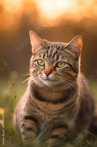 © Hanna, Fototapeta premium Portrait of an adorable tabby gray cat outdoor. Generative AI.